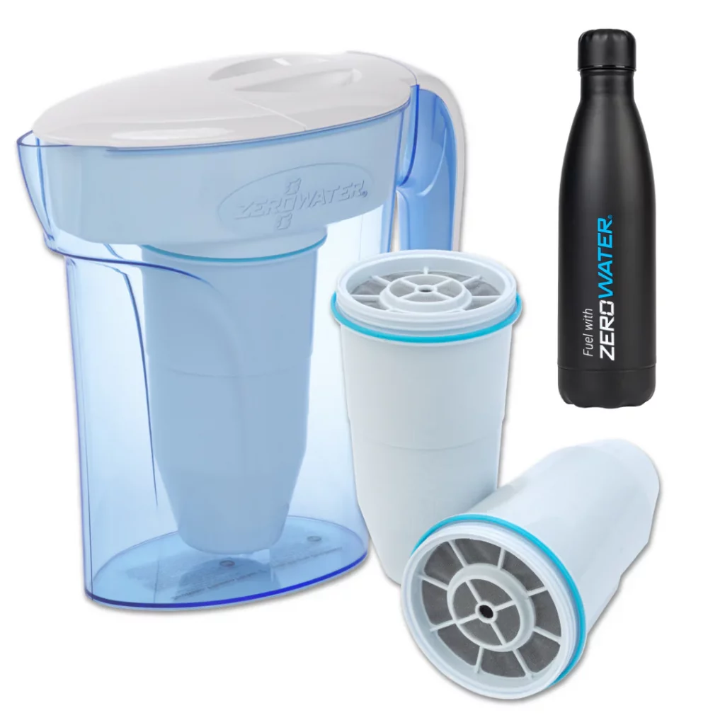 The Culligan ZeroWater Starter Pack has everything you need for pure-tasting water: a 1.7L filter jug, two extra filters, a Water Quality Meter to track dissolved solids, and a 500ml stainless steel bottle for hydration on the go. A complete, convenient bundle for clean water anytime, anywhere.